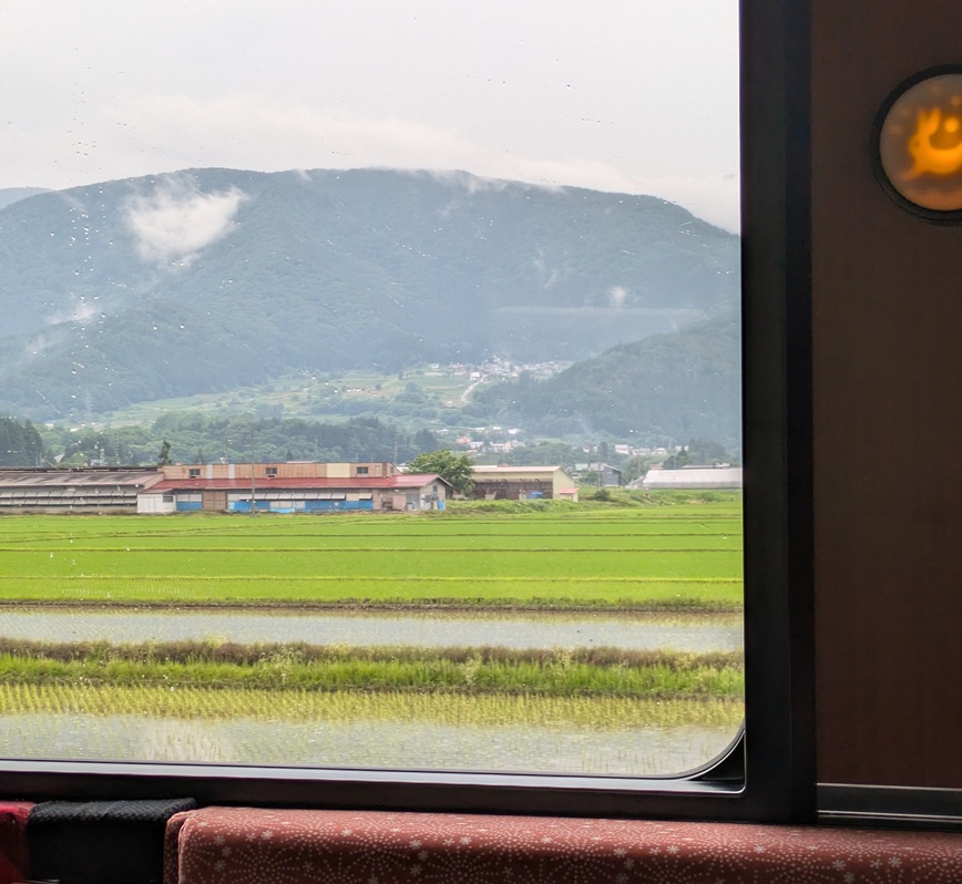 長野駅のホームに停まっていたおいこっとは、白い車体に緑のラインが印象的。 ドアを開けると木の香りがふわりと漂い、天井やテーブルにも信州産の木材が使われていました。 出発のベルが鳴ると、列車はゆっくりと信濃川沿いの田園地帯へ。 沿線の田んぼには水が張られ、青空が映り込む美しい光景が広がっていました。