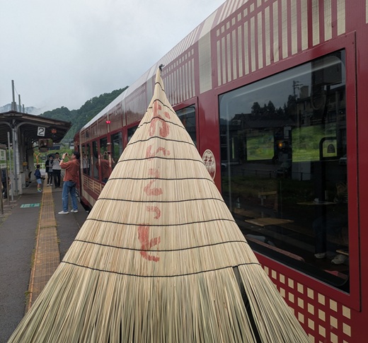 森宮野原駅で笠の試着!思った以上に温かいです!